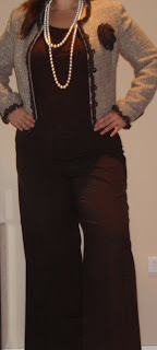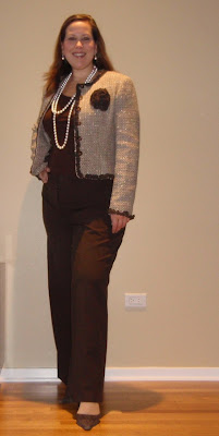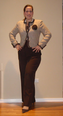 I LOVE THIS JACKET. What makes me a bit sad is the pants that I bought to wear with the jacket are currently in the “your ass is to fat to wear me” bin of clothes. Instead I’m wearing a fantastic pair of vanity sized Ann Taylor Loft pants. They have wide legs to fit my thunder thighs.