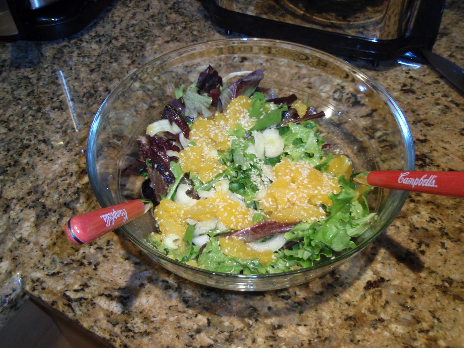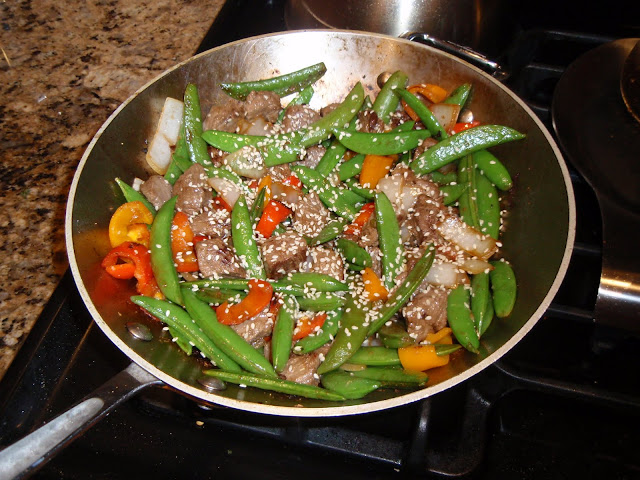 Stir Fry is so easy and their a so many combos out there.  Last nights was simple.  Top Sirloin with Snap Peas, Peppers and onions. I served it with Basmati rice and green salad with some diced onions and orange sections.