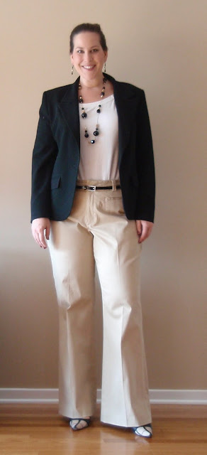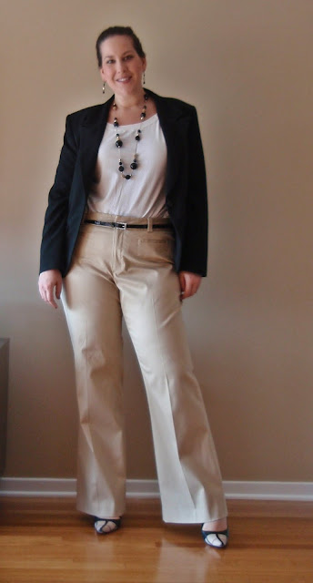 Today I am wearing a NEW pair of pants that I ripped the tag off of just this morning.  I’ve had these Banana Republic khaki pants for 3 years now and they have never fit properly.  But today they do..yippee!  BR pants fit smaller in the hips and thighs than most other brands that I wear and they are more true to size.  I’m almost to the point were I can wear a size 14’s in other brands yet I’m just fitting into size 16’s at Banana Republic.  I also have to buy longs at Banana Republic and have the legs shortened.  Regulars are to short yet the longs are too tall (story of my life, which is why I buy unhemmed pants when possible).