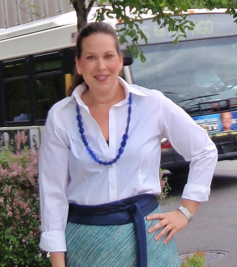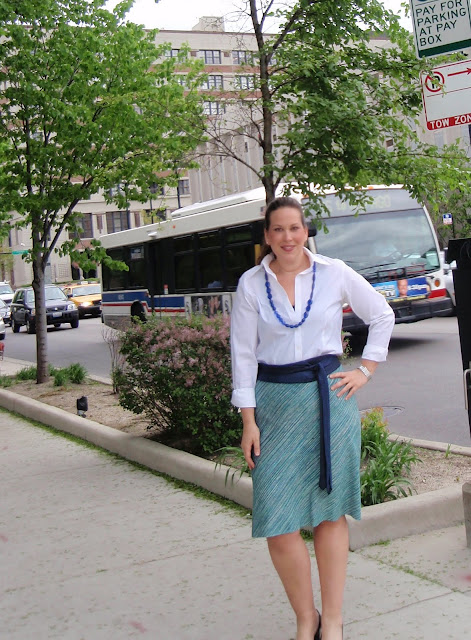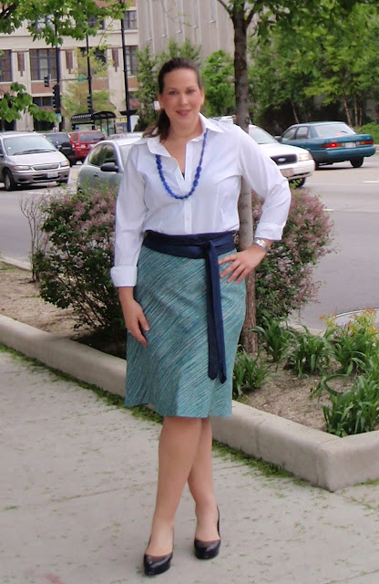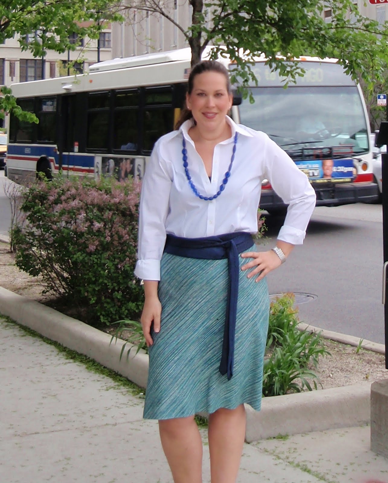 The tie/belt idea is a great one–I will have to try that! I LOVE the color combo in this outfit. I have a thing for combining blues right now. Lovely 🙂