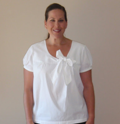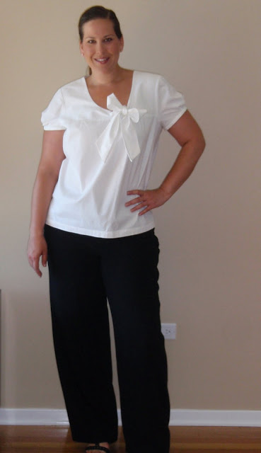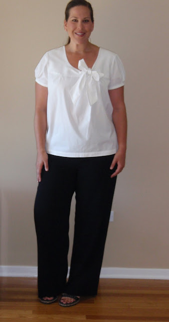 I was in a conference room all day today from 9-4 and my meeting didn’t require a suit!  I was unprepared to get dressed for work again today (normally I plan my outfit the night prior..with two options 1. feeling thin and 2. feeling bloated) .   Thus, I grabbed an alternate version of yesterdays black skirt, white shirt duds.  Today, black pants and a white shirt.  The shirt is a bit boxy, but I like the bow and not to mention that I was comfortable sitting for 7 hours in a hot conference room.