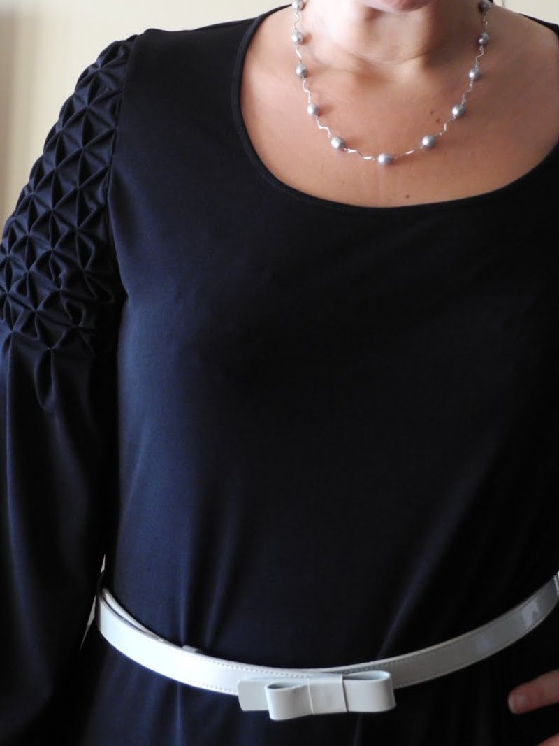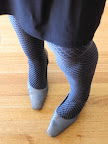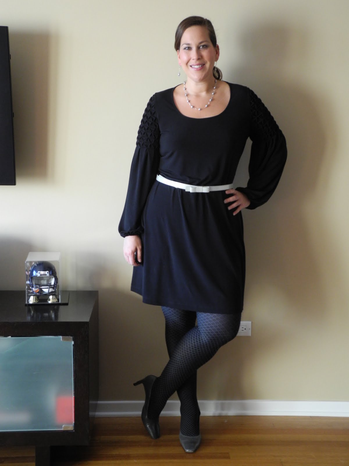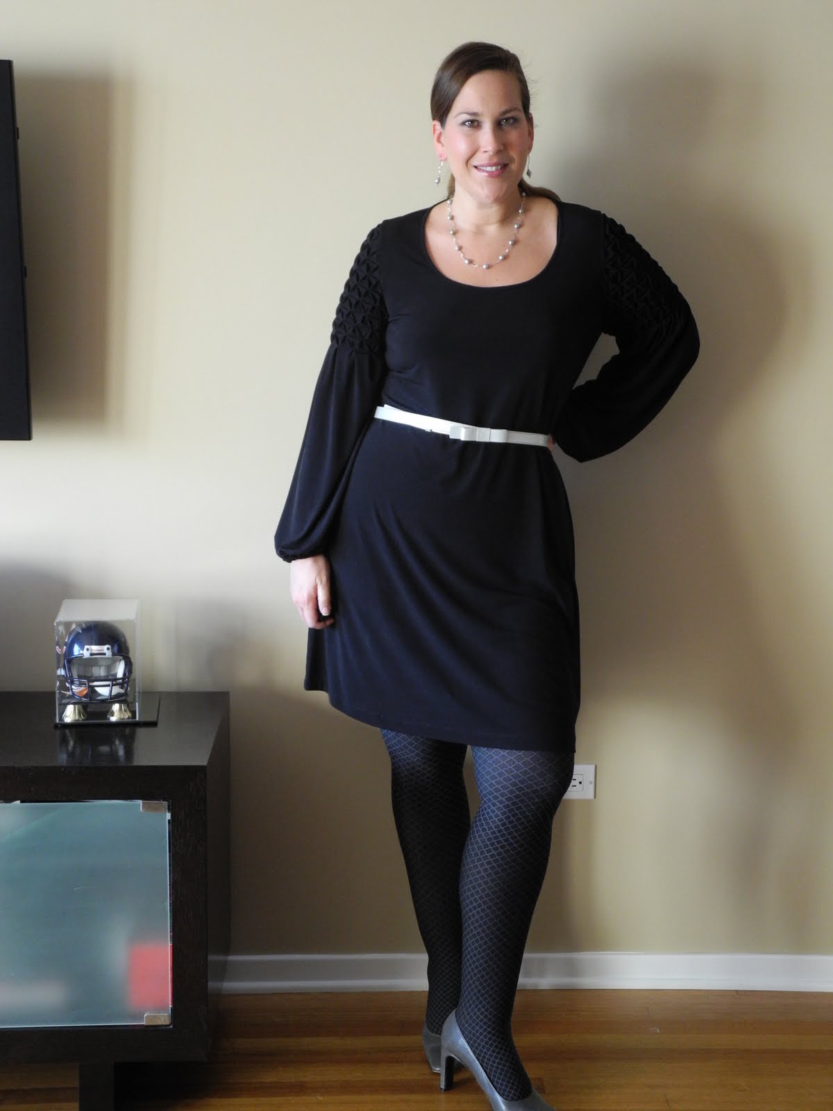 I originally bought this dress to wear to a fundraiser.  Back when I weighed 220+  the black slimmed me down and the A-line fell loosely over my hips.  30+ lbs lighter, it looks like a black sack without a belt.  Its pretty amazing how clothes still fit, they just fit differently when you lose weight.  I love the little bow on the belt that I wore today and the grey pattern in my hose.  A touch of whimsy in an otherwise all black outfit.