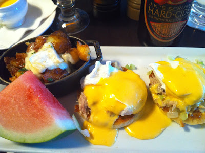 Charlie and I decided to have bunch at one of our favorite restaurants that was on the way home, The Gage. I ordered a delicious Eggs Benedict (eggs, braised rabbit, Bearnaise sauce on a toasted English muffin) that came with roasted potatoes and Camembert cheese. Oh and watermelon, as a garnish. Yes, I ate every single bite of the 900 calories I burned running. And I enjoyed every morsel and calorie consumed.