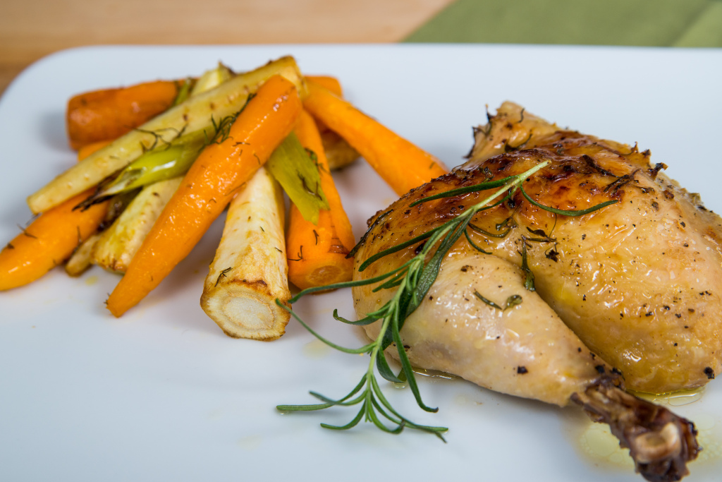 I love to use produce when it is just harvested and the early fall (okay technically it is still summer, but it feel like fall to me) is the perfect time for carrots, parsnips and green onions. Roasted vegetable are easy to make. They make great leftovers and accompany any meat or fish as a side dish. I might be biased but, I think they go perfect with Pan Roasted Lemon Rosemary Chicken.