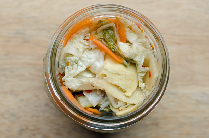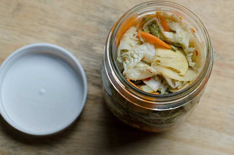 4. Combine the cabbage, carrots, ginger, garlic and crushed pepper flakes in a large bowl then pack into mason jars. Pour the hot vinegar mixture on top and seal jars. Cool jars then refrigerate for at least 4 days before eating.
