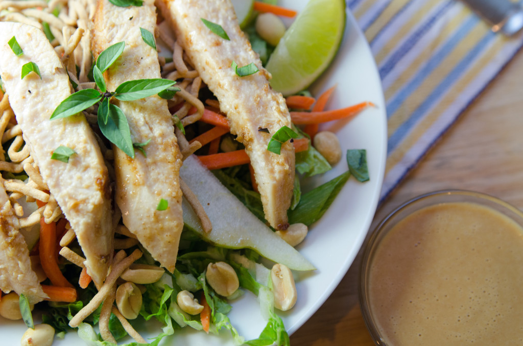 What I love about this salad? The combination of the sweet pear, the salty peanuts, the tangy dressing, the peppery cabbage and the fresh herbs, it’s a flavor explosion! And, it’s less than 400 calories WITH DRESSING! Pair with a crusty dinner roll and you have an amazing and filling meal.