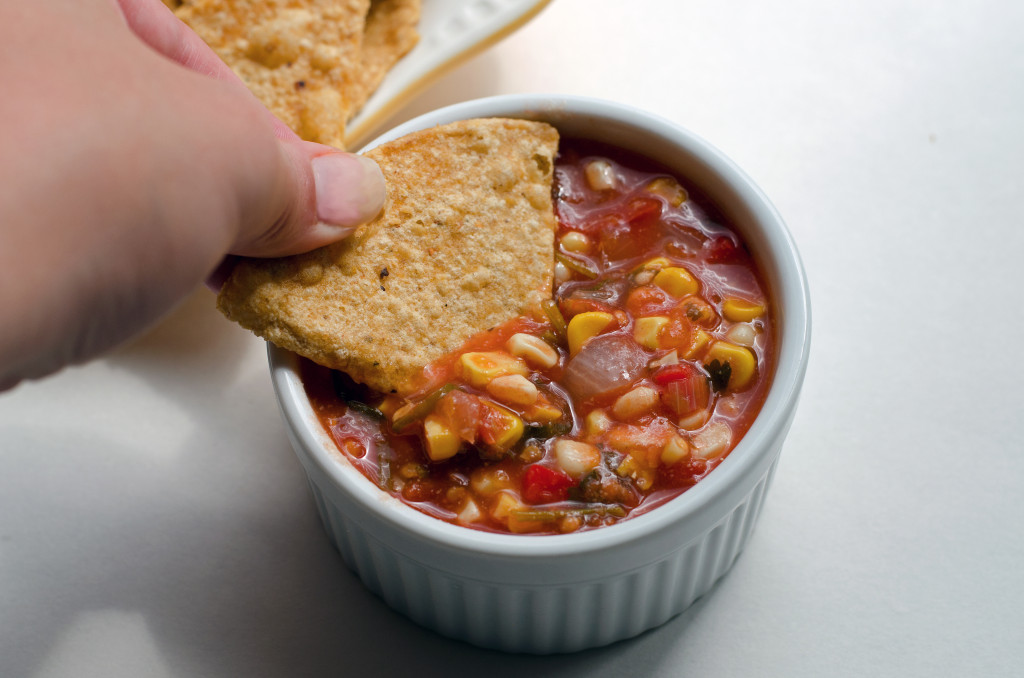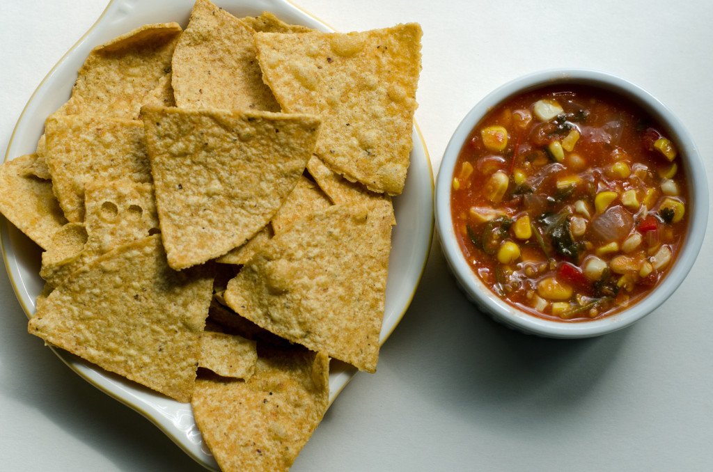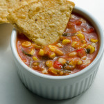 Every fall I take advantage of all my ripe tomatoes and make salsas to eat all winter long. I typically double the canning recipe so I have a dozen jars in my cupboard for the winter. I really like this salsa recipe because of its versatility.  The thechip and salsa