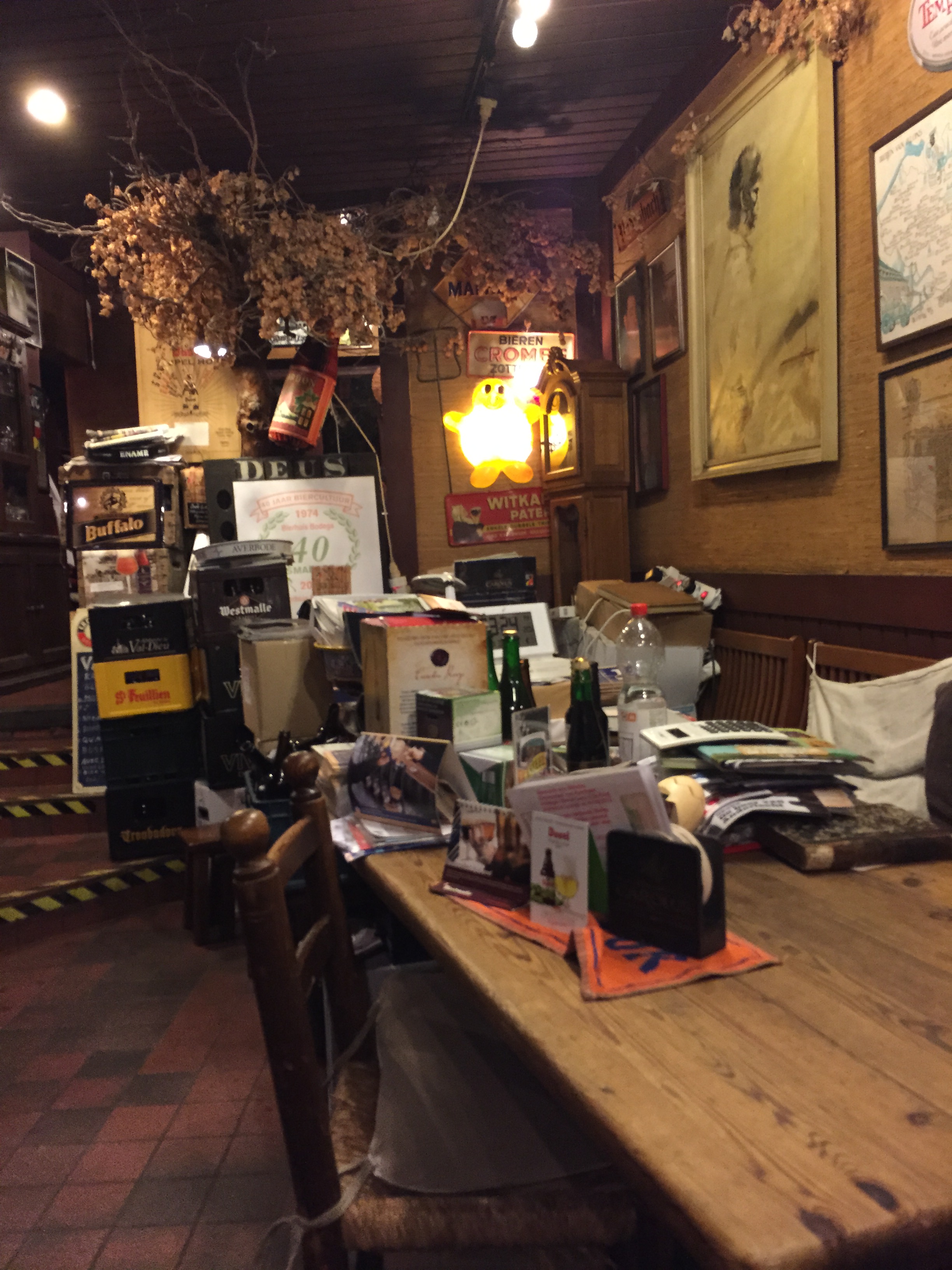 Folk, this is a weird place. And by weird, I mean, yes that is the owner mail sitting on a table in the middle of the bar. SHIT EVERYWHERE. I honestly wanted to start cleaning. I’m pretty sure the owners are hoarders. And I’m also pretty sure the hops on the ceiling have been there since the place was erected. But if you’re a beer nerd, it’s a pretty bad ass place. The woman takes the orders and serves the beer while the some man, I think the nice woman’s husband, fetches bottles from the cellar. The beer list is impressive. They also have a stellar cheese plate with either old cheese OR new cheese (if you ask for a combo, you get two plates of cheese…which yes, Charlie and I gleefully ate. Hey, teenage rock bands work up an appetite). (Don’t forget to check back next Tuesday for a full recap of my dining adventures in Belgium.)