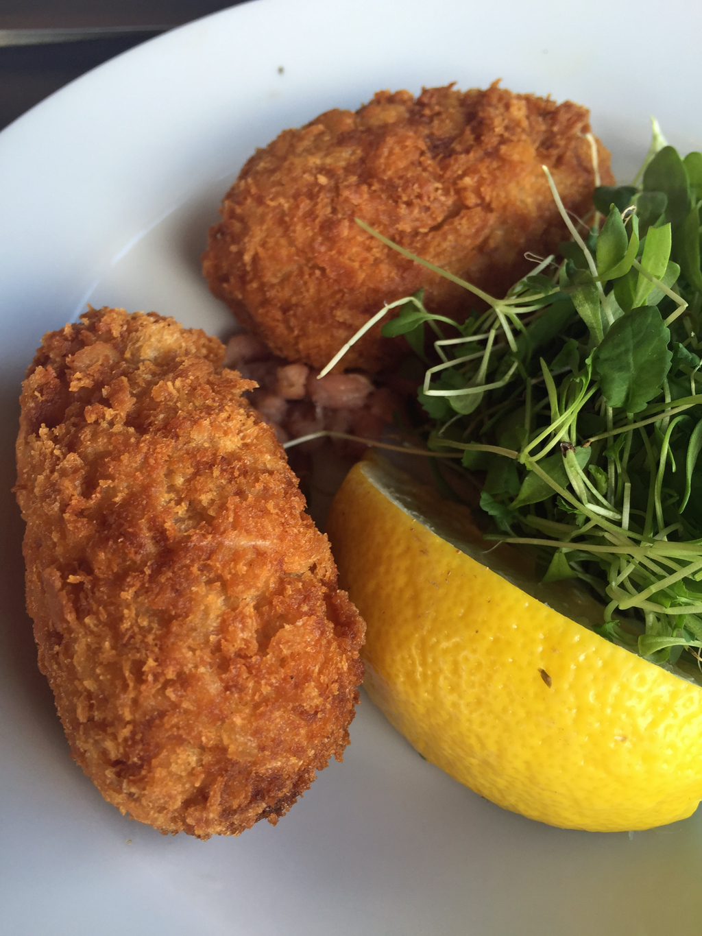 In addition to enjoying delicious beer at Orval we enjoyed a lovely lunch at the Abbey cafe.  We split a plate of cheese croquettes.  Belgian croquettes are not made with potatoes, rather they have a filling of either  creamy cheese or a North Sea shrimp called brown shrimp.  As an entree they are usually served with a salad and fried parsley.