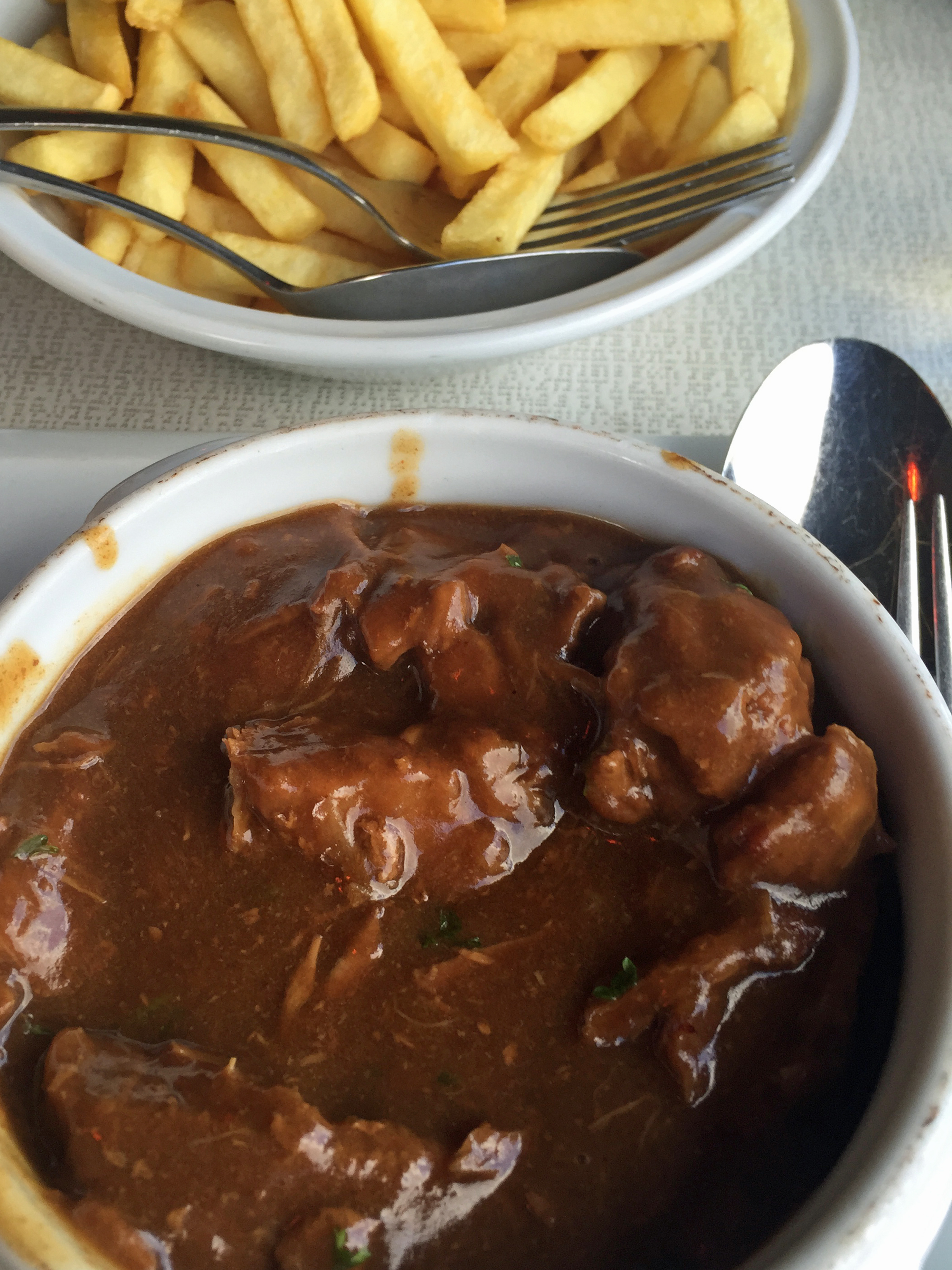 Ghent StewAs I mentioned in my Ghent post, we started our day with a relaxing lunch at a cafe along the canals.   I ordered the traditional Ghent stew which was surprisingly delicious.  Ghent stew, also called  Stoverij or Flemish Stew, is beef braised with dark beer and flavored with Ghent Mustard and Thyme. It is typically served with french fries.  The gravy makes an excellent dipping sauce.