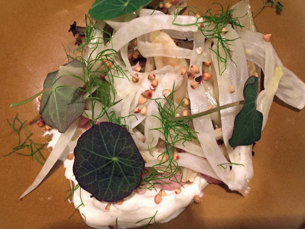 When planning the last meal of our trip I had a tough decision to make, eat at another Kobe Desramaults restaurant, Vitrine, or try one of the other restaurants suggested to me?  I went with the latter and chose j.e.f. as our final dinning destination.  J.e.f. was the perfect last meal in Belgium.  The food was bold with very clean flavors.  Every bite was more delicious that the next.  My favorite dish was the  fennel salad with yogurt, pickled onions,  nasturtium topped with pine nuts and dill.  What seems like such an odd combination was delectable.  An adventurous meal to close out and adventurous trip, a perfect finale.