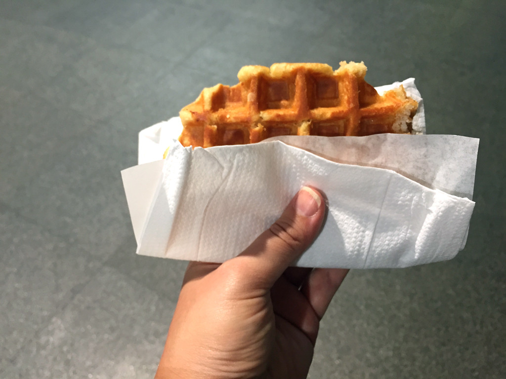 By far the best street waffle I have ever had in Belgium is from the guy at the train station in Antwerp.  He makes a variant of the Leige waffle.   The density is somewhere between a traditional (batter) Brussels waffle and a Legie  (brioche) waffle and has the little pearls of sugar Liege waffles are know for.  It was the perfect sweet pick-me-up snack after walking the cobblestone streets of Antwerp.