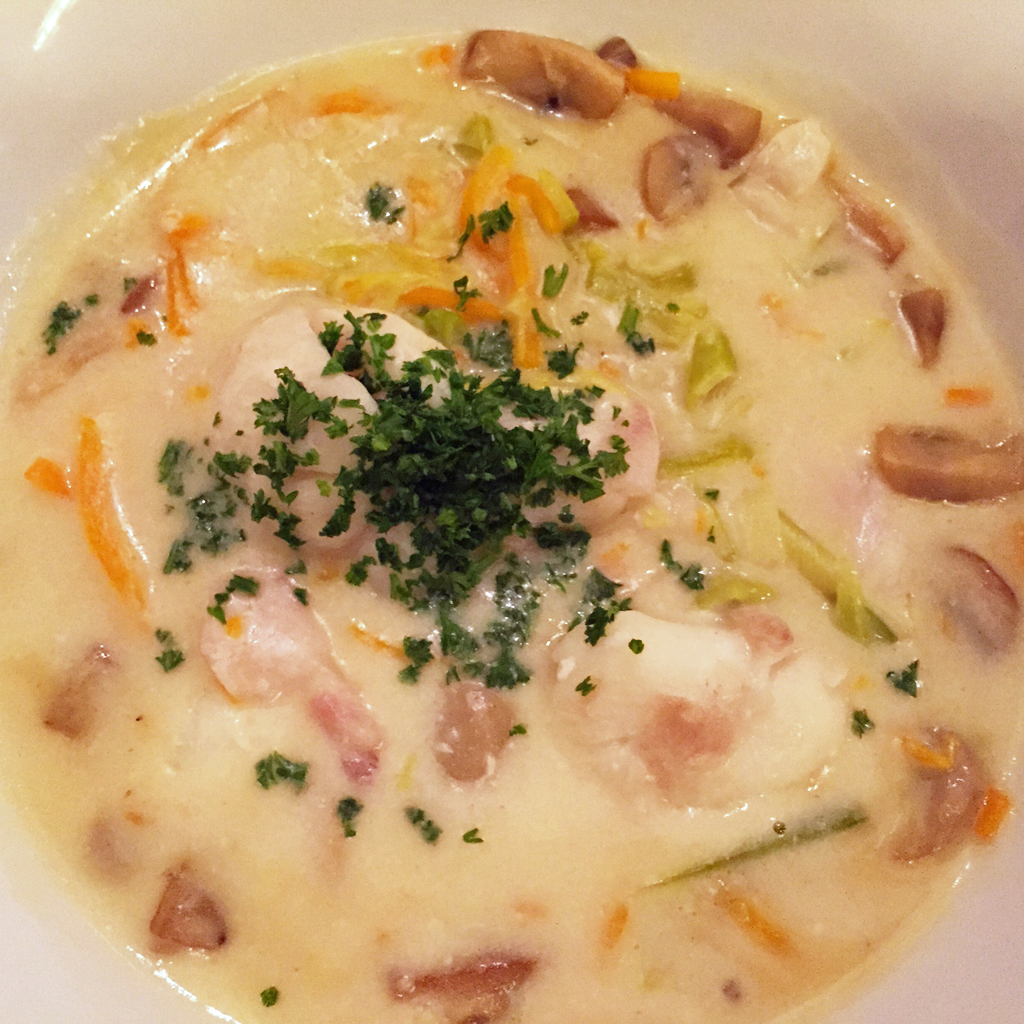 We ended our stay in Brussles with a fantastic dinner at the gastopub Nuetnigenough. It is a very small restaurant serving traditional dishes accompanied by a curated menu of first-rate Belgium beer. When I saw Waterzooi on the menu my dinner choice was immediately made. Waterzooi is a fish stew (though you will find it prepared with chicken too) made with egg yolks, cream and a thickened vegetable broth. In addition to fish it contains carrot, onion, celeriac, leek and potato that are flavored with thyme, bay leaves and sage. It’s a creamy, rich and delicious.