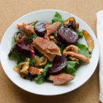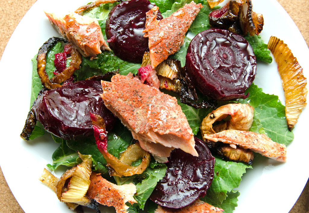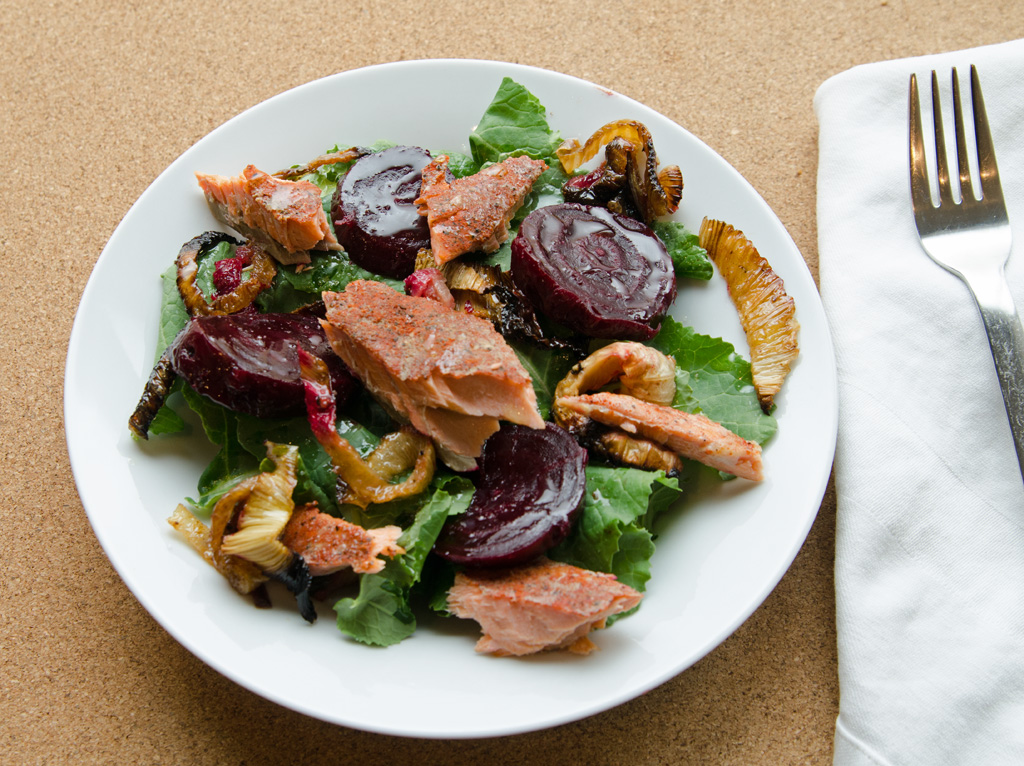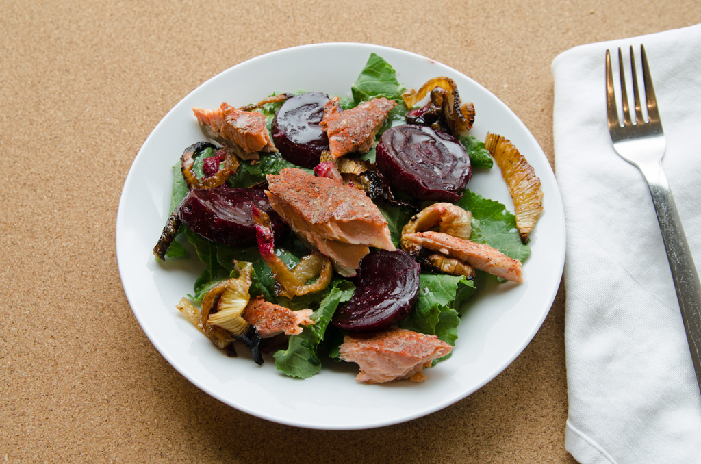In a bowl place greens, top with salmon, beets and leeks. Dress with vegetable drippings.