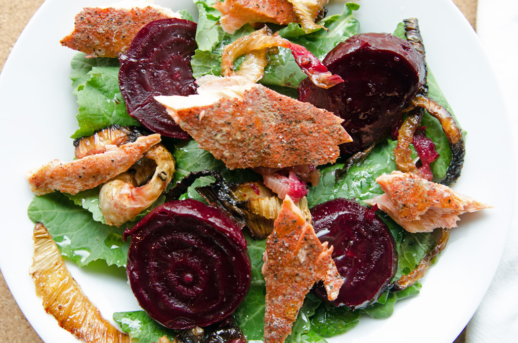 I normally cook up several beets and pieces of salmon and then eat the wrest as leftovers. Need a quick meal on the go? This combo tastes awesome rolled up in a whole grain wrap. And the dressing..because it is cooked, the lemon is really mellow and it becomes super rich from the vegetable drippings. SO SO SO delicious. But the piece de resistance are the cripy leeks. They add a nice little crunch.