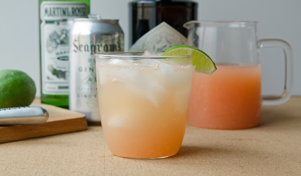 In a glass stir gin, vermouth, lime juice and grapefruit juice. Add ice, top with ginger ale. Serve with a lime wedge and enjoy!