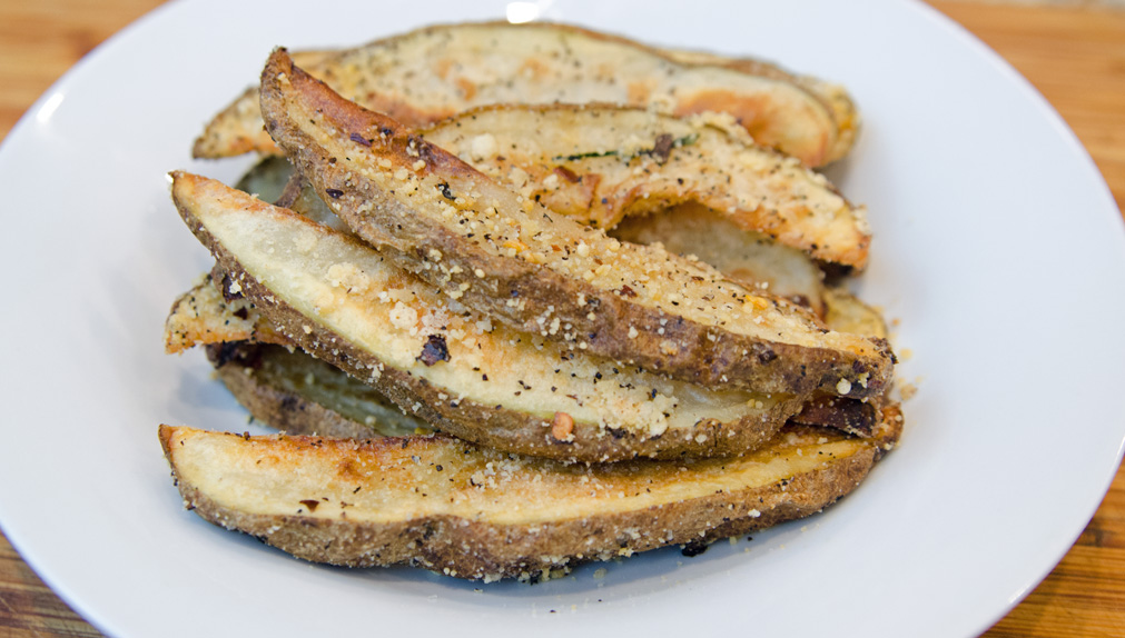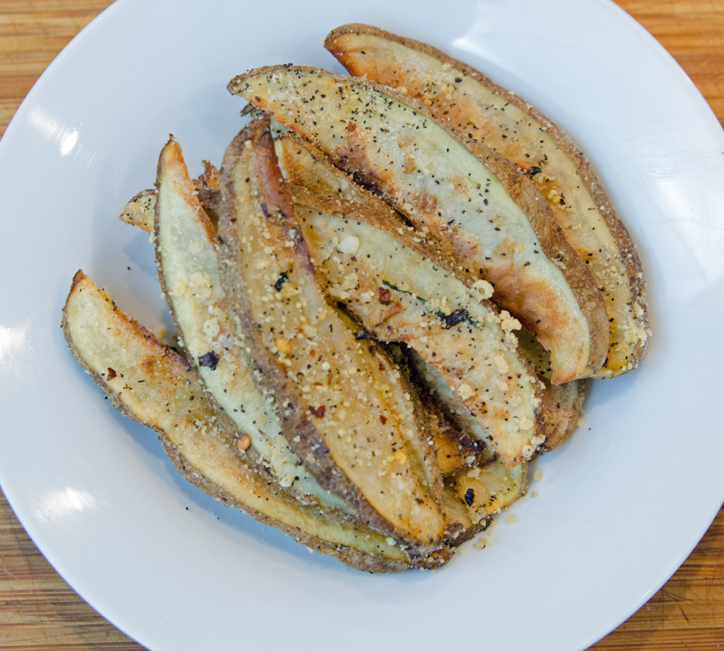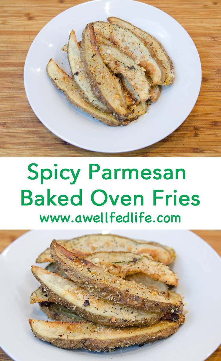 French Fries, hot and crisp right out of the fryer dipped into thick and tangy Heinz ketchup.  Is that drool running down your chin just thinking about them?  *sigh* Me too.  They are so scrumptious.  EVIL little bastards I tell you with 100 calories per measly ounce.    Not waist line friendly, AT ALL.   Which is why I love these easy to make Baked Spicy Parmesan Oven Fries.  They are a quarter of the fat, half the calories and all the flavor.
