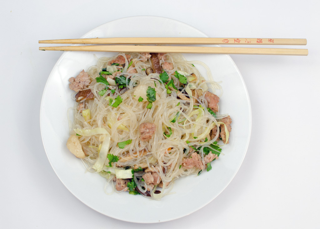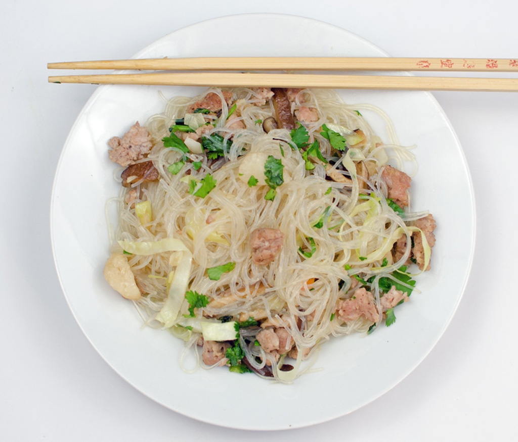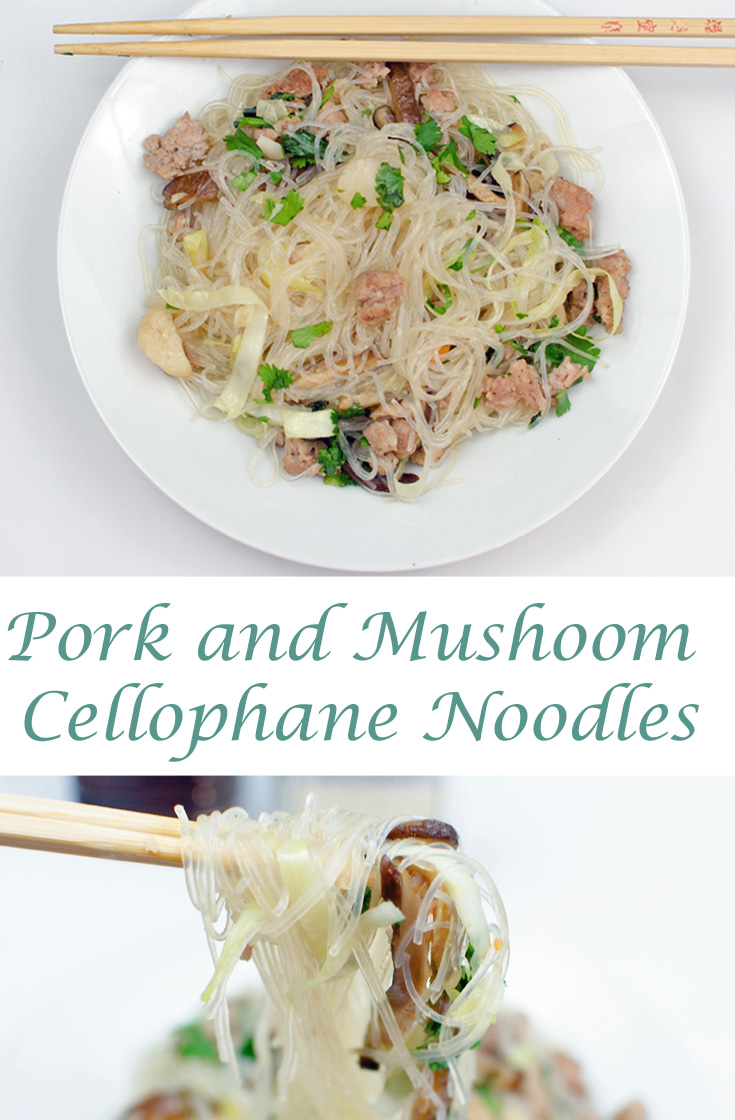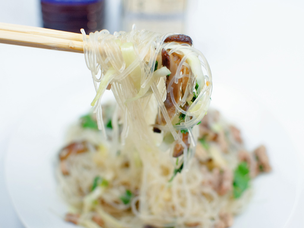 This Filipino inspired noodles dish with pork, mushrooms and cellophane noodles has a bright citrus sauce that can be eaten hot or cold.
