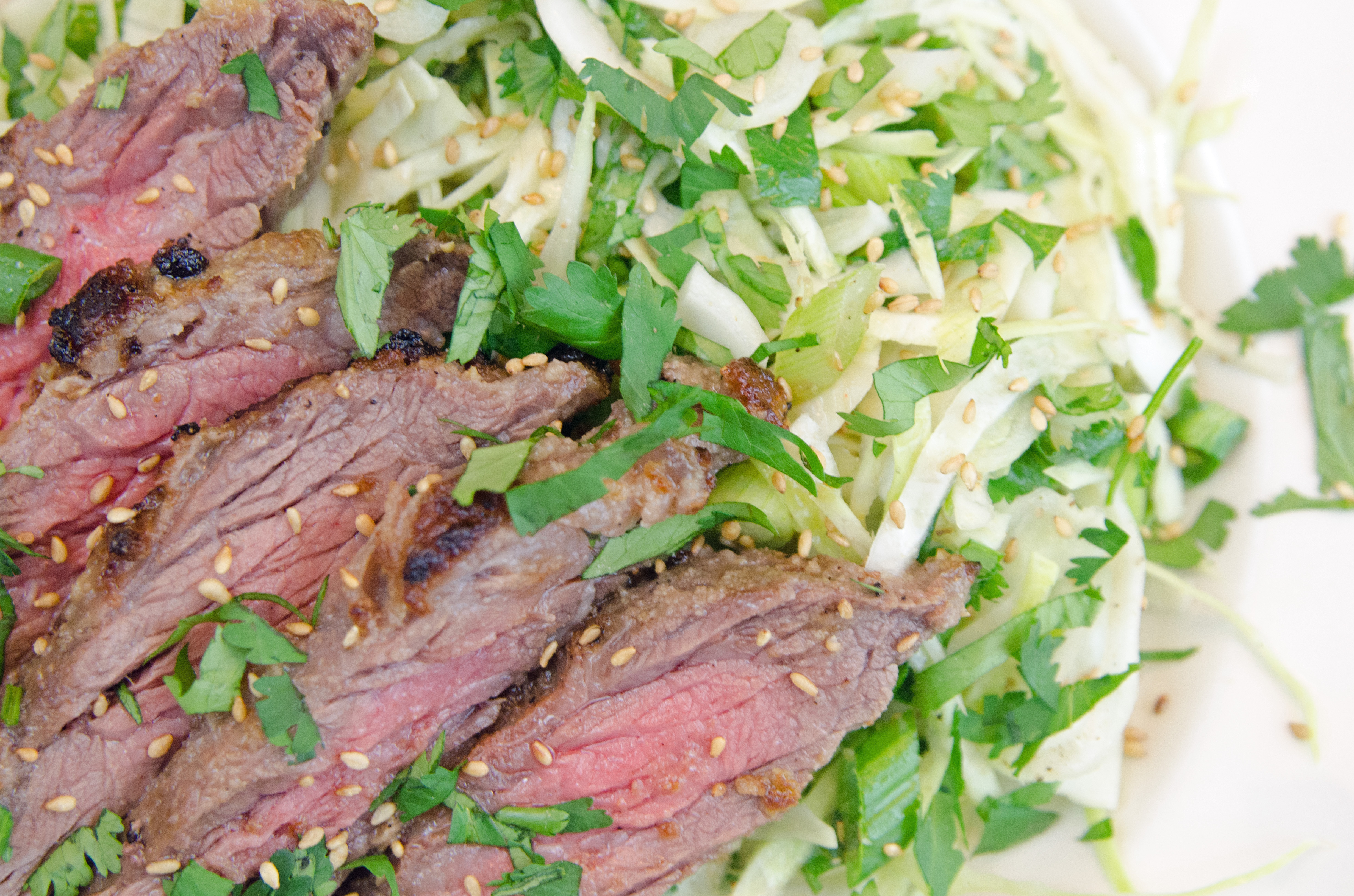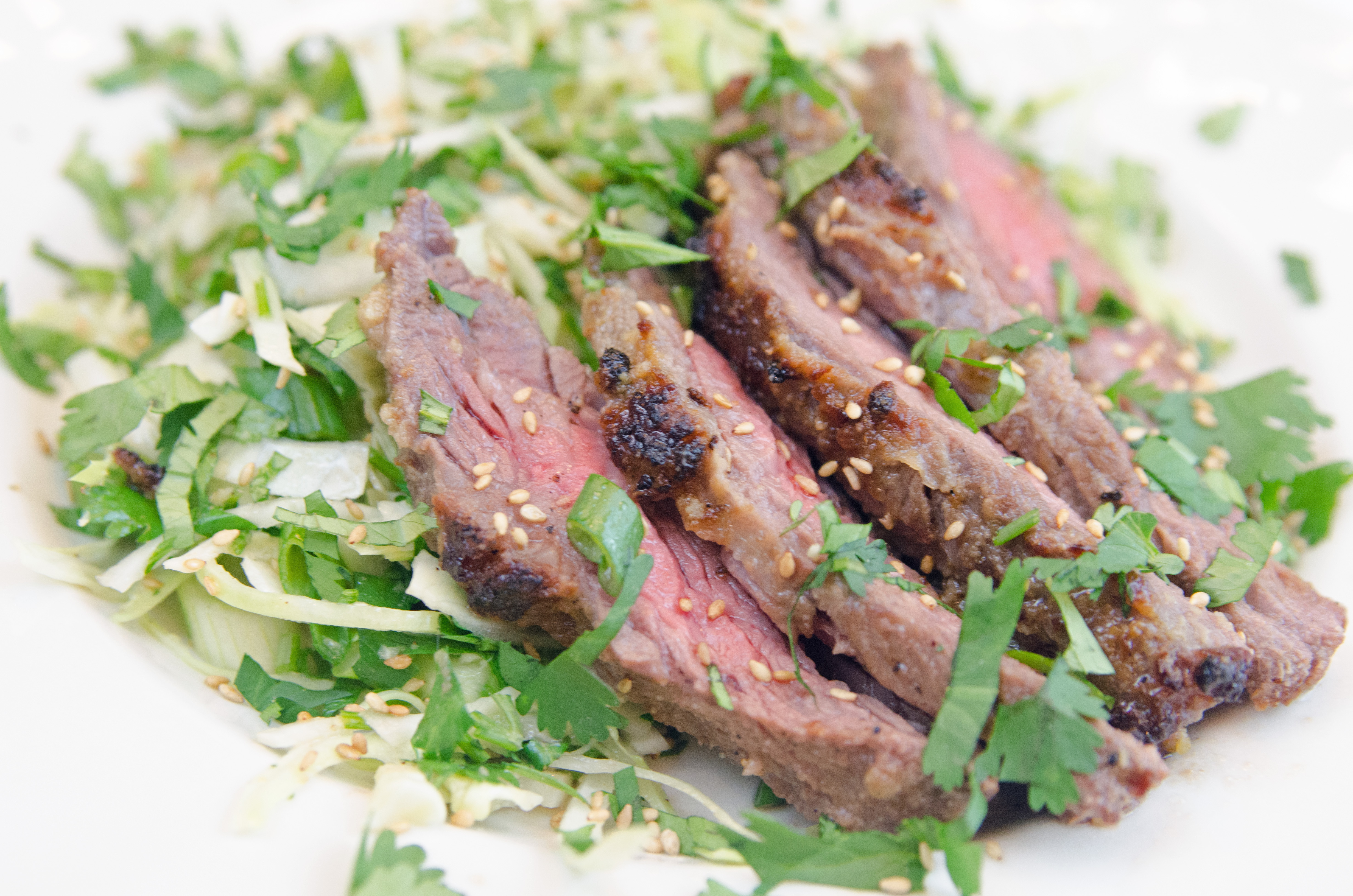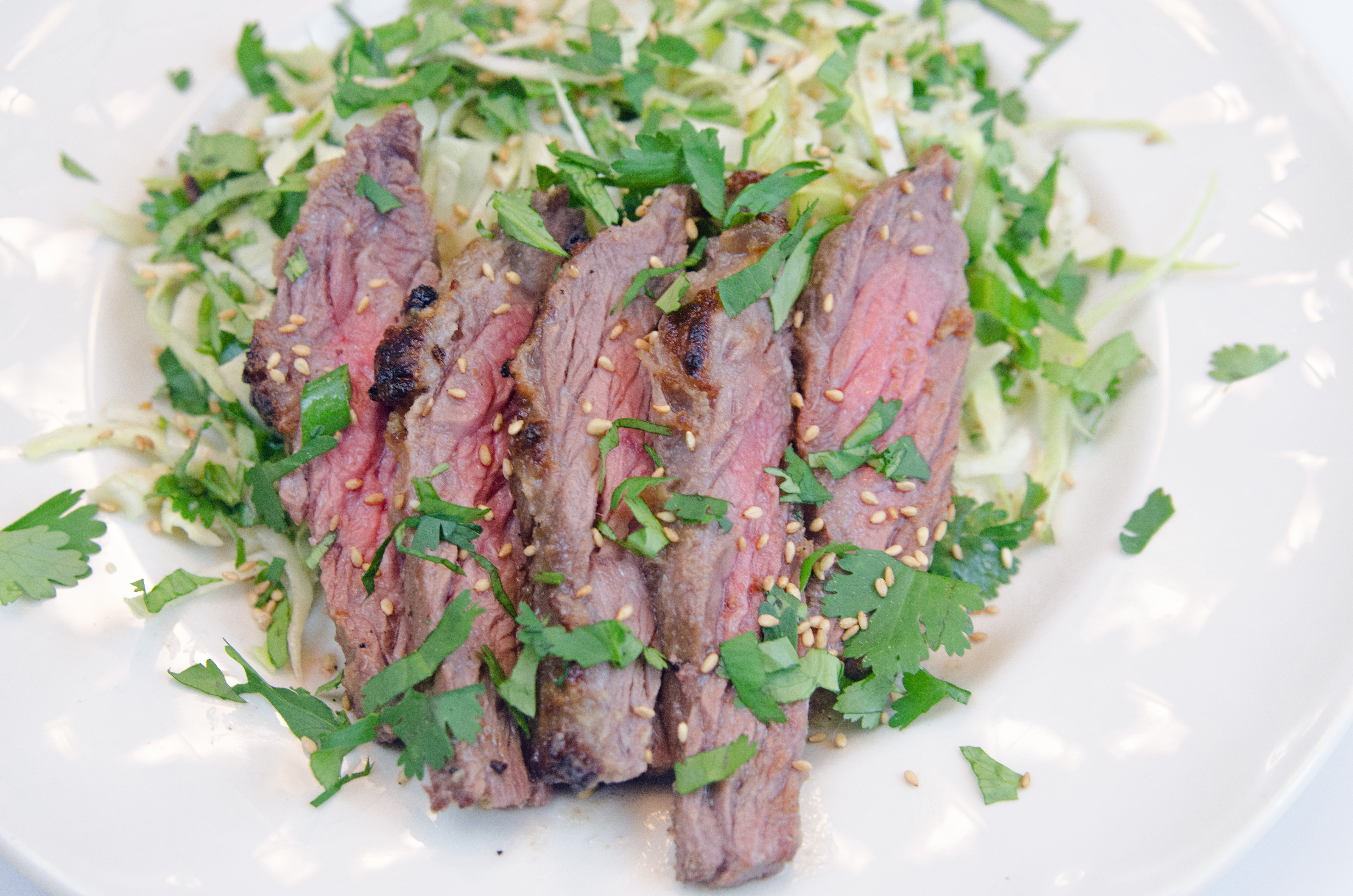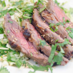 Slice steak and sprinkle with sesame seeds and cilantro.
