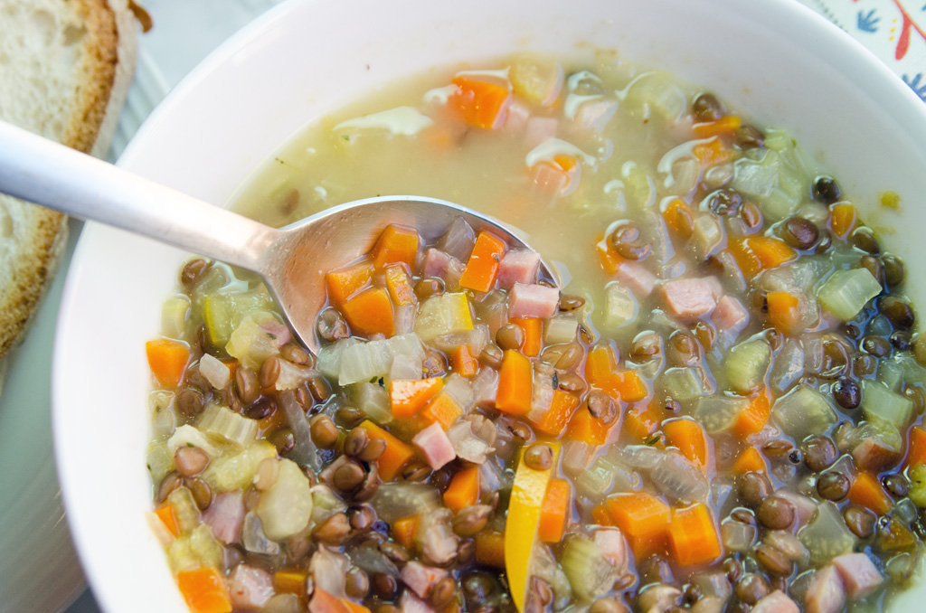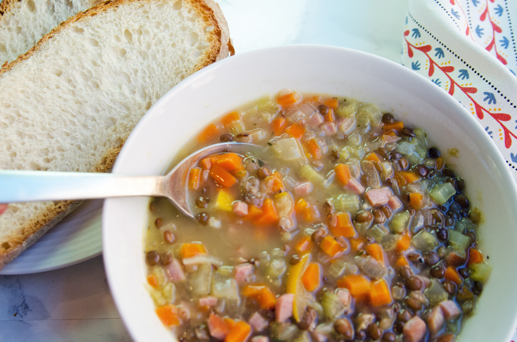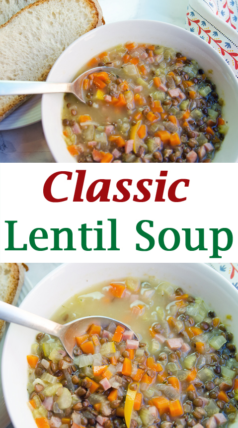 Classic Lentil Soup, seasoned with ham and vegetables, is a healthy bowl of comfort food. This soup is easy to make, reheats and freezes well.