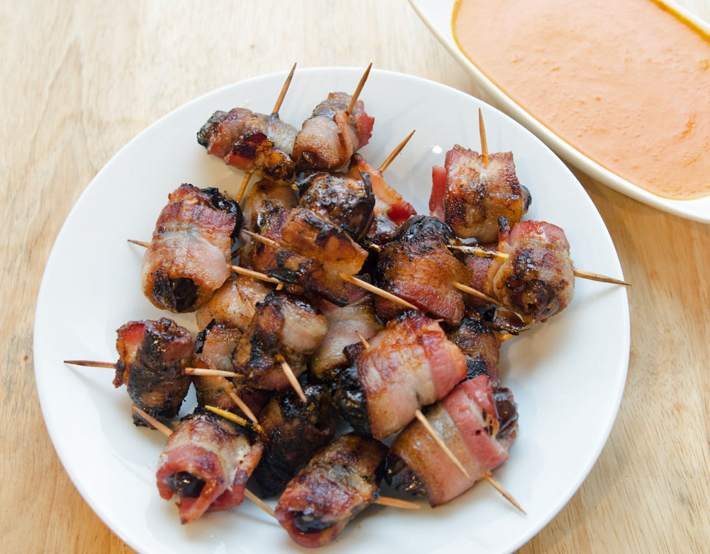 Bacon Wrapped Dates with Red Pepper Sauce