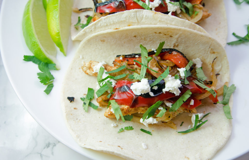 Chicken Tacos with Fire Roasted Red Peppers and Goat Cheese